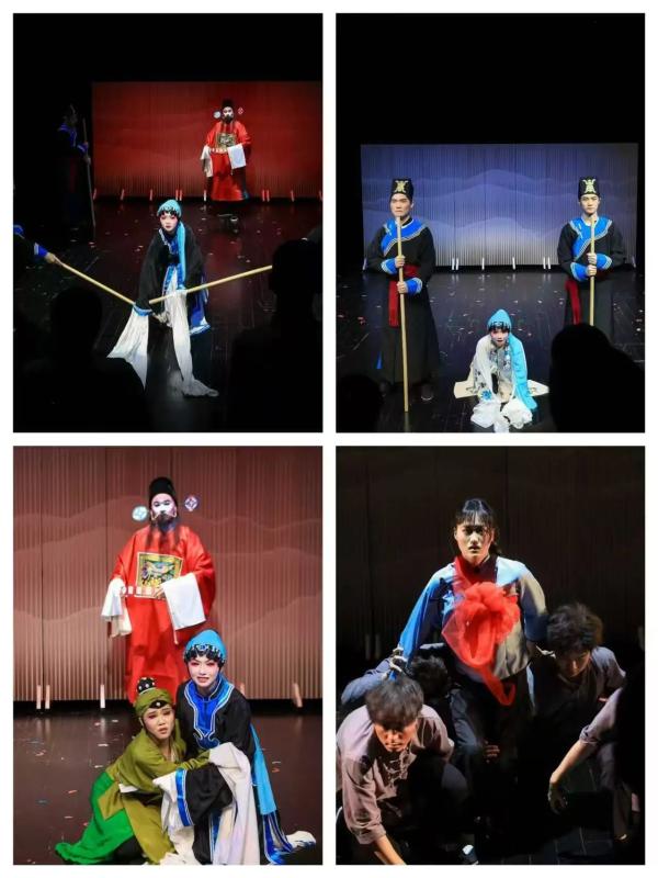 劇組師生8月9日返校,在北京人藝著名演員朱少鵬、戲劇教育專家王谷川和我校表演教師武杰的聯(lián)合指導(dǎo)下,精心打磨劇本,逐場(chǎng)推敲演員表達(dá)方式?!峨p雪記》以元雜劇《竇娥冤》為靈感原點(diǎn),聚焦七百年來中國人民為追求真理與自由解放的不懈抗?fàn)帲宫F(xiàn)個(gè)體在時(shí)代洪流中從蒙昧到覺醒的精神蛻變。劇中融入中國傳統(tǒng)戲曲元素,利用“手眼身法步”等肢體表達(dá)形式虛實(shí)相生、藝術(shù)傳情。學(xué)生們以飽滿的熱情,在舞臺(tái)上一遍遍摸爬滾打,深刻體悟角色的內(nèi)心情感與外部表達(dá)。經(jīng)過11天的高強(qiáng)度排練,角色呈現(xiàn)形神兼容,極具藝術(shù)感染力。