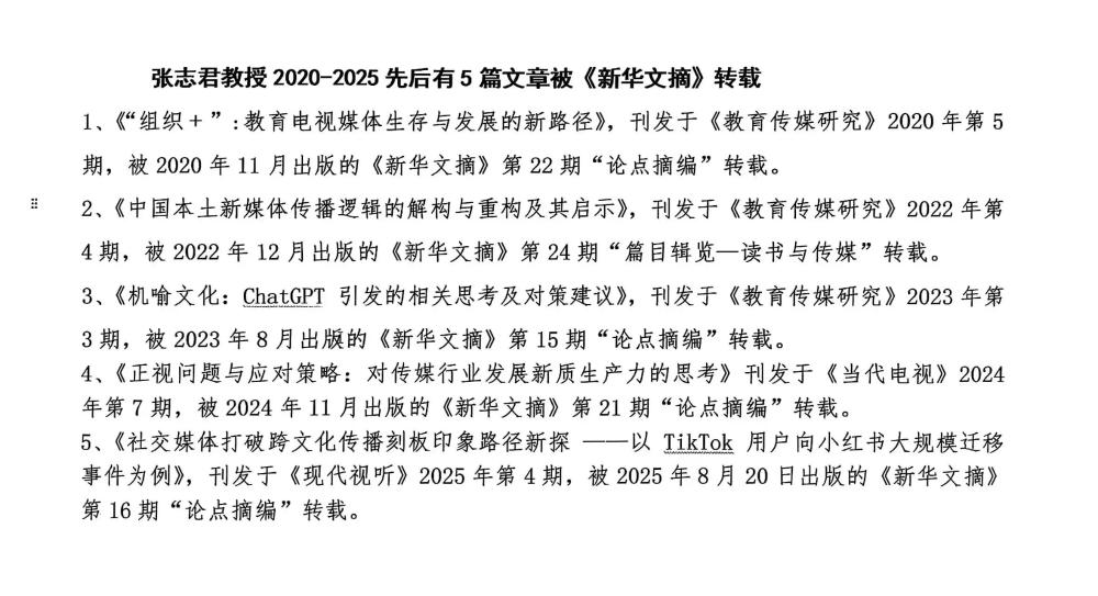 在2020年至2025年的五年間,張志君教授共有《“組織+”:教育電視媒體生存與發(fā)展的新路徑》《中國本土新媒體傳播邏輯的解構(gòu)與重構(gòu)及其啟示》《機(jī)喻文化:ChatGPT引發(fā)的相關(guān)思考及對(duì)策建議》《正視問題與應(yīng)對(duì)策略:對(duì)傳媒行業(yè)發(fā)展新質(zhì)生產(chǎn)力的思考》等五篇論文相繼被《新華文摘》轉(zhuǎn)載,彰顯了其持續(xù)的學(xué)術(shù)影響力與前沿洞察力。