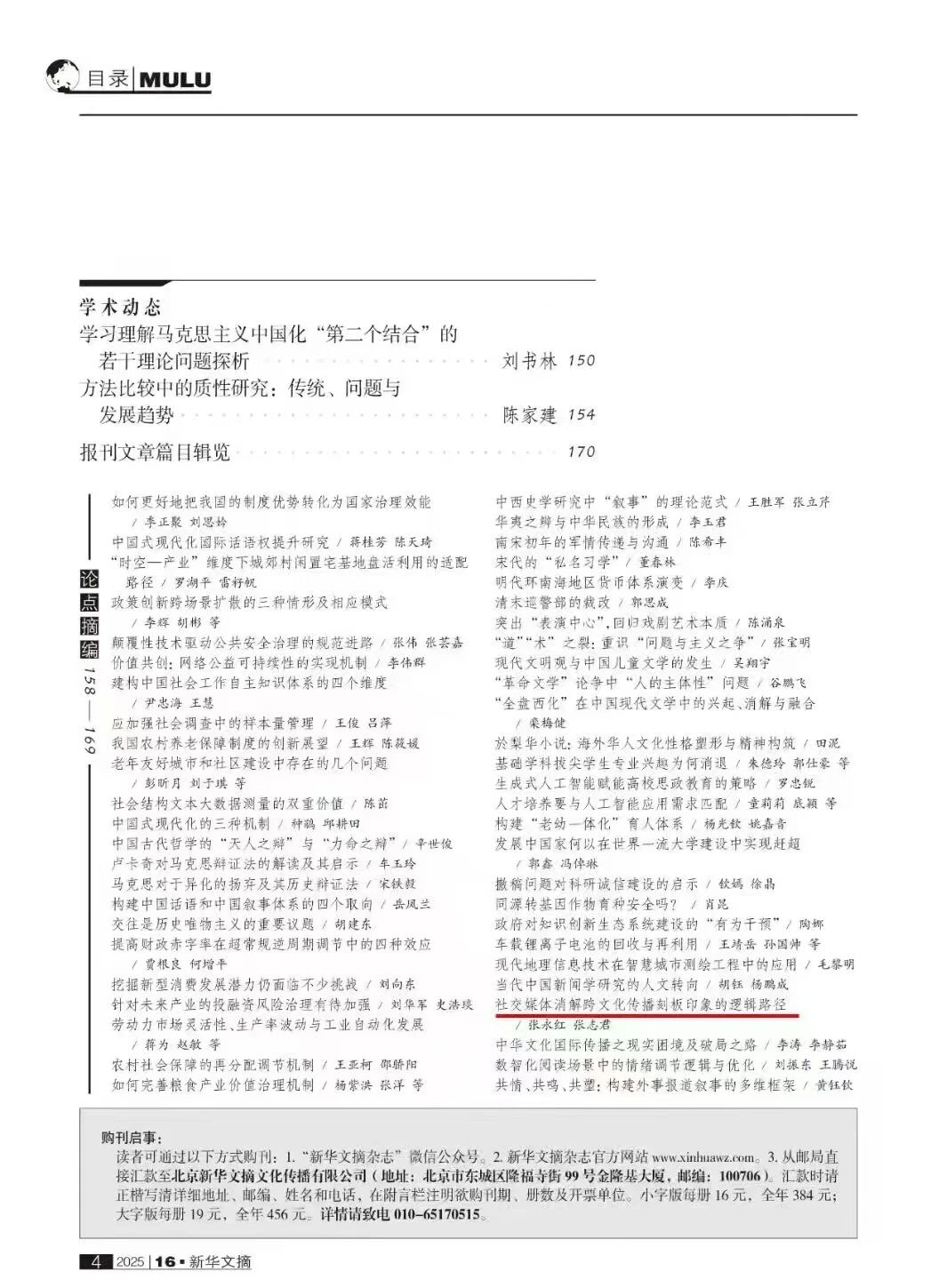 近日,權(quán)威文摘類期刊《新華文摘》2025年第16期出版,我校影視藝術(shù)學(xué)院張志君教授發(fā)表于《現(xiàn)代視聽》的論文《社交媒體打破跨文化傳播刻板印象路徑新探》被“論點(diǎn)摘編”欄目轉(zhuǎn)載。