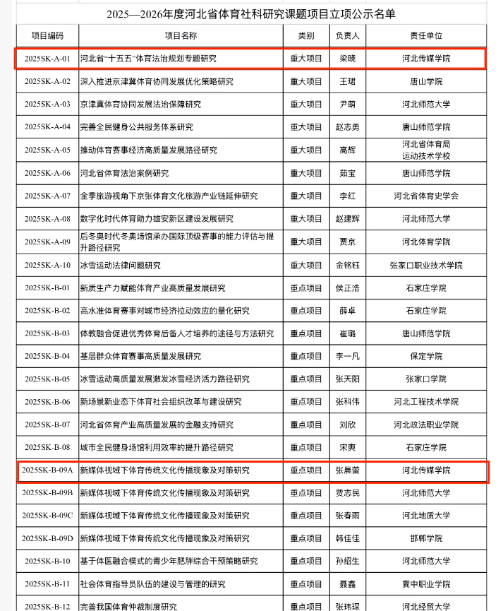 近日,河北省體育局正式公布 2025—2026 年度河北省體育社科研究課題立項(xiàng)名單。其中,我校馬克思主義學(xué)院梁曉院長(zhǎng)牽頭的《河北省 “十五五” 體育法治規(guī)劃專題研究》成功獲批重大課題立項(xiàng),文化產(chǎn)業(yè)管理學(xué)院張晨蕾老師申報(bào)的《新媒體視域下體育傳統(tǒng)文化傳播現(xiàn)象及對(duì)策研究》獲批重點(diǎn)課題立項(xiàng)。這是我校在體育領(lǐng)域科研立項(xiàng)上的重大突破。此次重大課題與重點(diǎn)課題的成功立項(xiàng),是相關(guān)學(xué)院領(lǐng)導(dǎo)和教師艱苦努力的結(jié)果,也同學(xué)校長(zhǎng)期以來(lái)對(duì)科研工作的高度重視密不可分。今后,我校將繼續(xù)以高質(zhì)量科研立項(xiàng)和科研成果為河北省體育事業(yè)發(fā)展及體育強(qiáng)省建設(shè)提供有力的學(xué)術(shù)支持和決策參考。