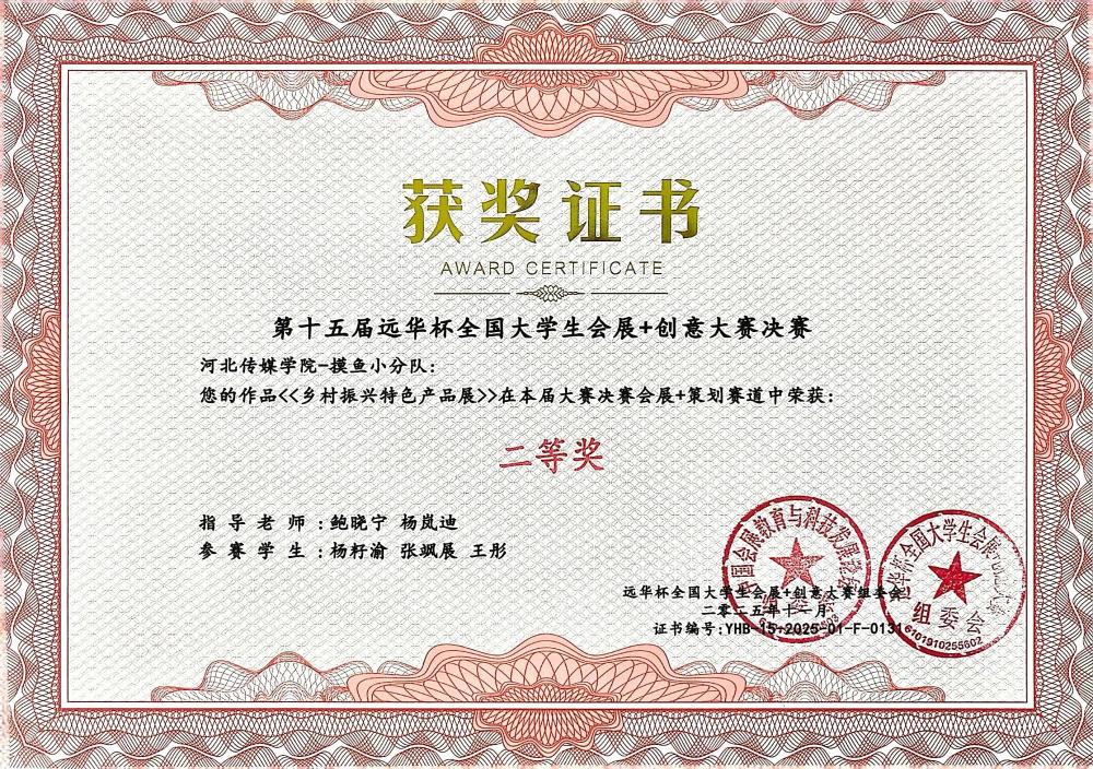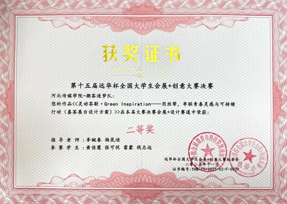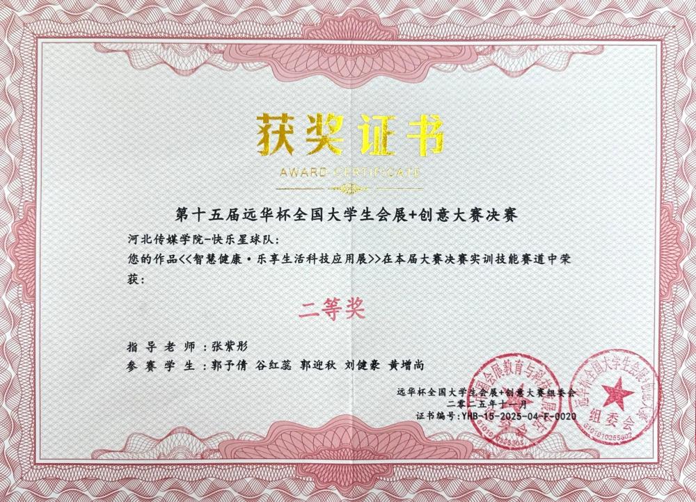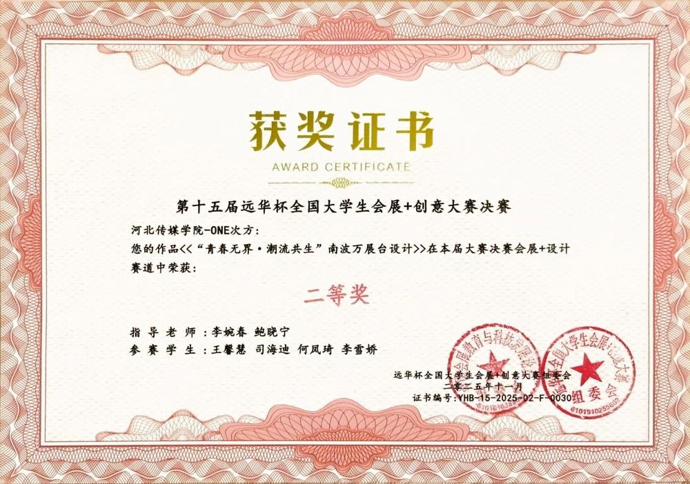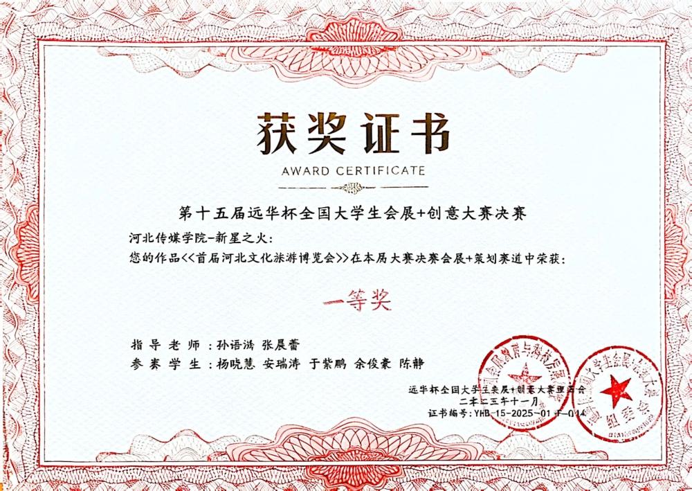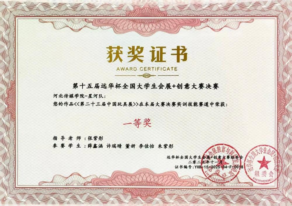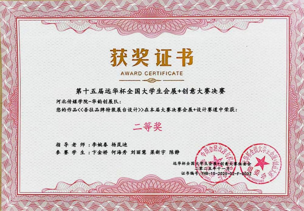 11月7日至9日,第十五屆“遠(yuǎn)華杯”全國(guó)大學(xué)生會(huì)展+創(chuàng)意大賽決賽在廣州清遠(yuǎn)成功舉辦。作為全國(guó)會(huì)展專業(yè)領(lǐng)域極具影響力的賽事,本屆大賽吸引了來(lái)自全國(guó)87所高校的464支隊(duì)伍同臺(tái)競(jìng)技,并最終篩選出113支隊(duì)伍晉級(jí)決賽。我校學(xué)生憑借出色的綜合表現(xiàn)在決賽中斬獲多項(xiàng)榮譽(yù):河北傳媒學(xué)院獲教學(xué)成果一等獎(jiǎng),“新星之火隊(duì)”《首屆河北文化旅游博覽會(huì)》、“星河隊(duì)”《第二十三屆中國(guó)玩具展》摘得一等獎(jiǎng),其余隊(duì)伍斬獲二等獎(jiǎng)5項(xiàng)。