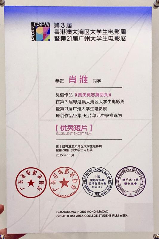 近日,“少年馭光,幀見未來”第3屆粵港澳大灣區(qū)大學(xué)生電影周與第21屆廣州大學(xué)生電影展系列活動之“大灣區(qū)青年電影人創(chuàng)作訓(xùn)練營”圓滿收官。由我校影視藝術(shù)學(xué)院徐興標(biāo)老師指導(dǎo)、戲劇影視文學(xué)專業(yè)畢業(yè)生肖淮導(dǎo)演的畢業(yè)設(shè)計(jì)扶持計(jì)劃劇情作品《莫失莫忘莫回頭》在“青創(chuàng)營”中脫穎而出,被評為“優(yōu)秀短片”,并在“晚風(fēng)FUN映”電影之夜獲得導(dǎo)師團(tuán)的高度評價,贏得了現(xiàn)場觀眾的一致好評。